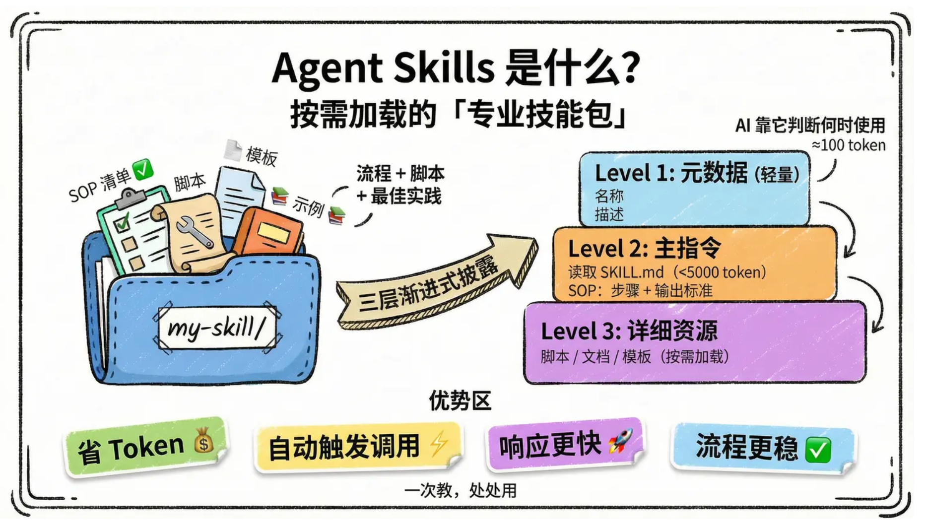 • 它将指令、脚本、模板和资源文件打包管理,让 AI 的能力得以沉淀、共享和迭代。