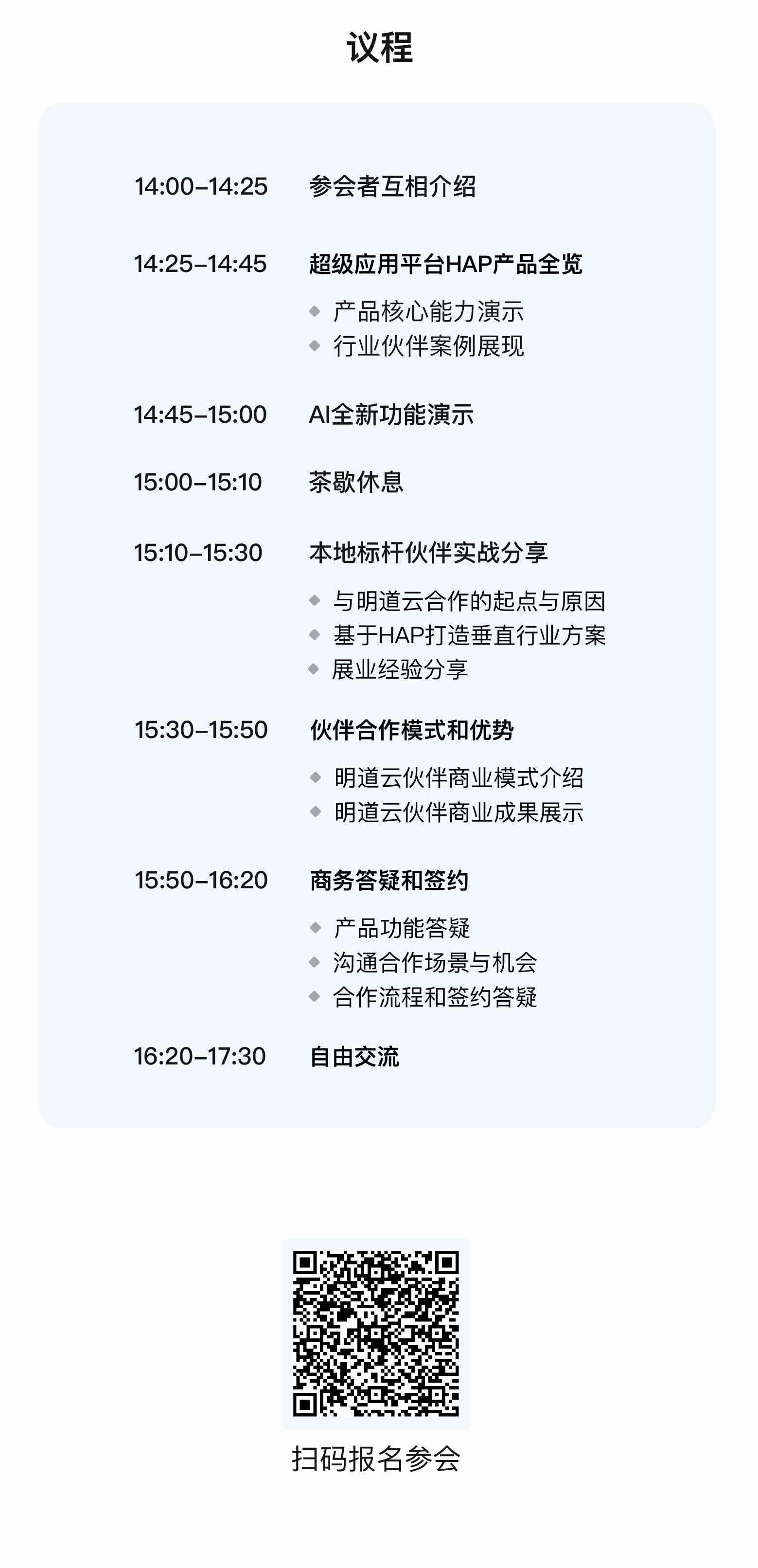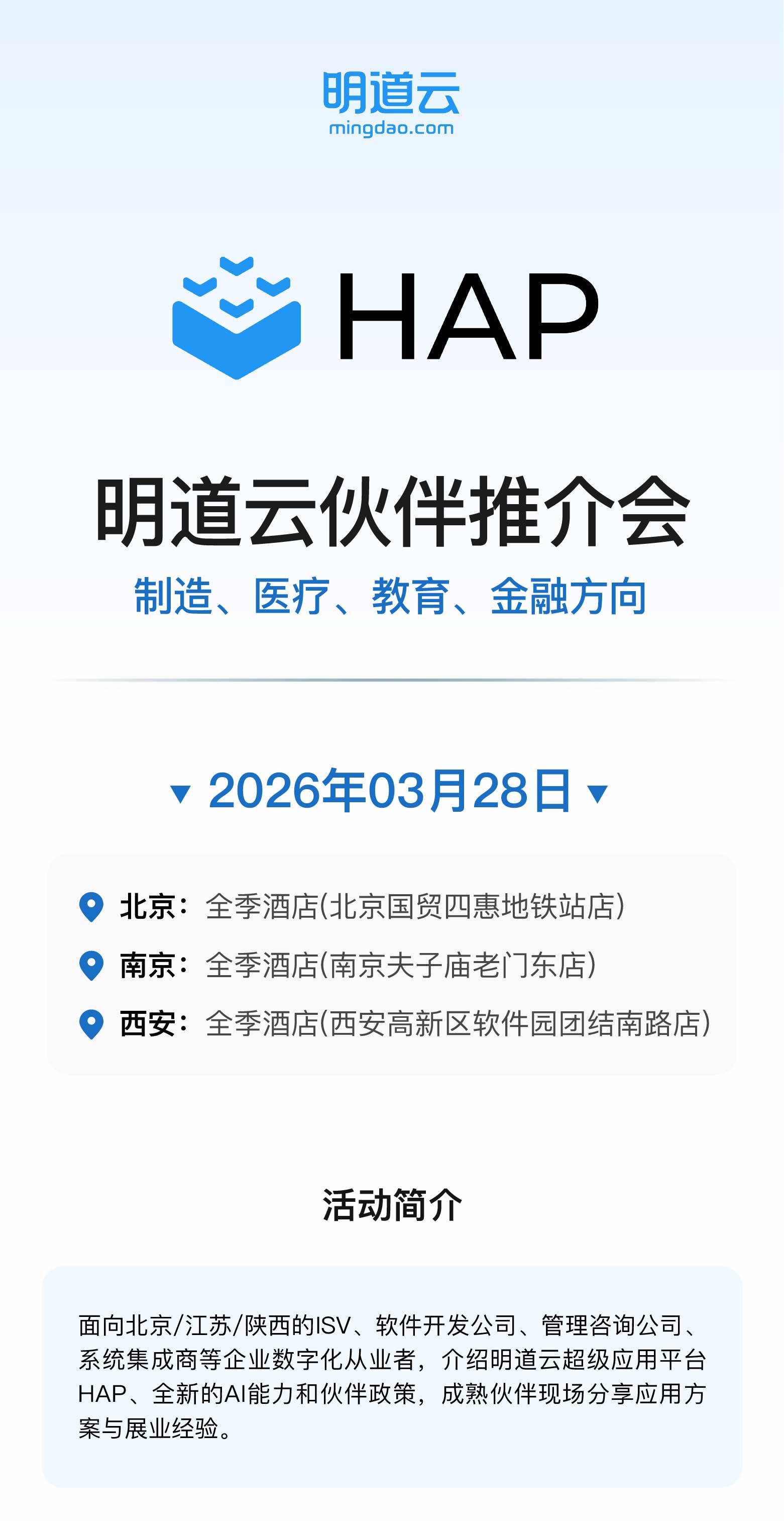 3月28日,明道云伙伴推介会将在北京、西安、南京三地同期举办,欢迎扫码报名。请持续关注我们,了解更多城市的区域伙伴推介会信息。